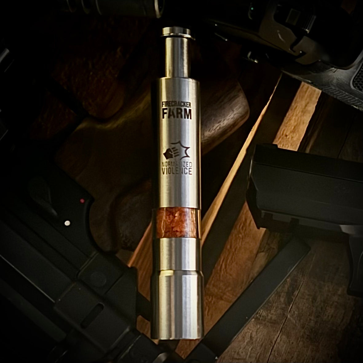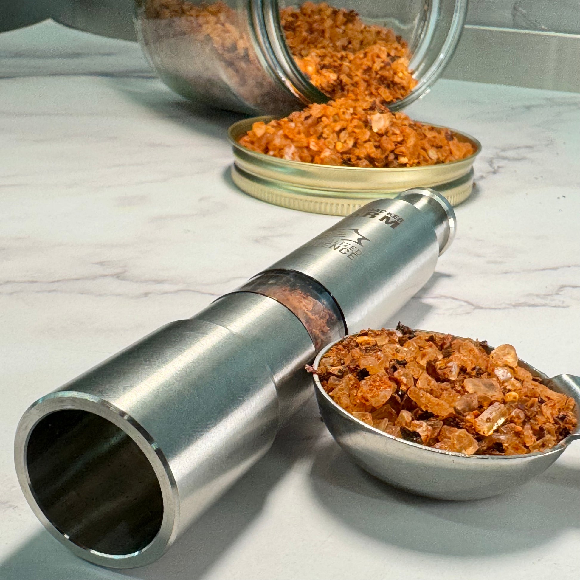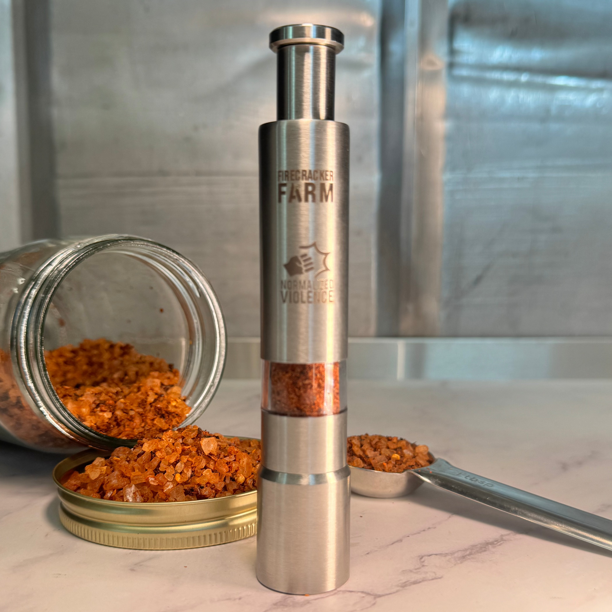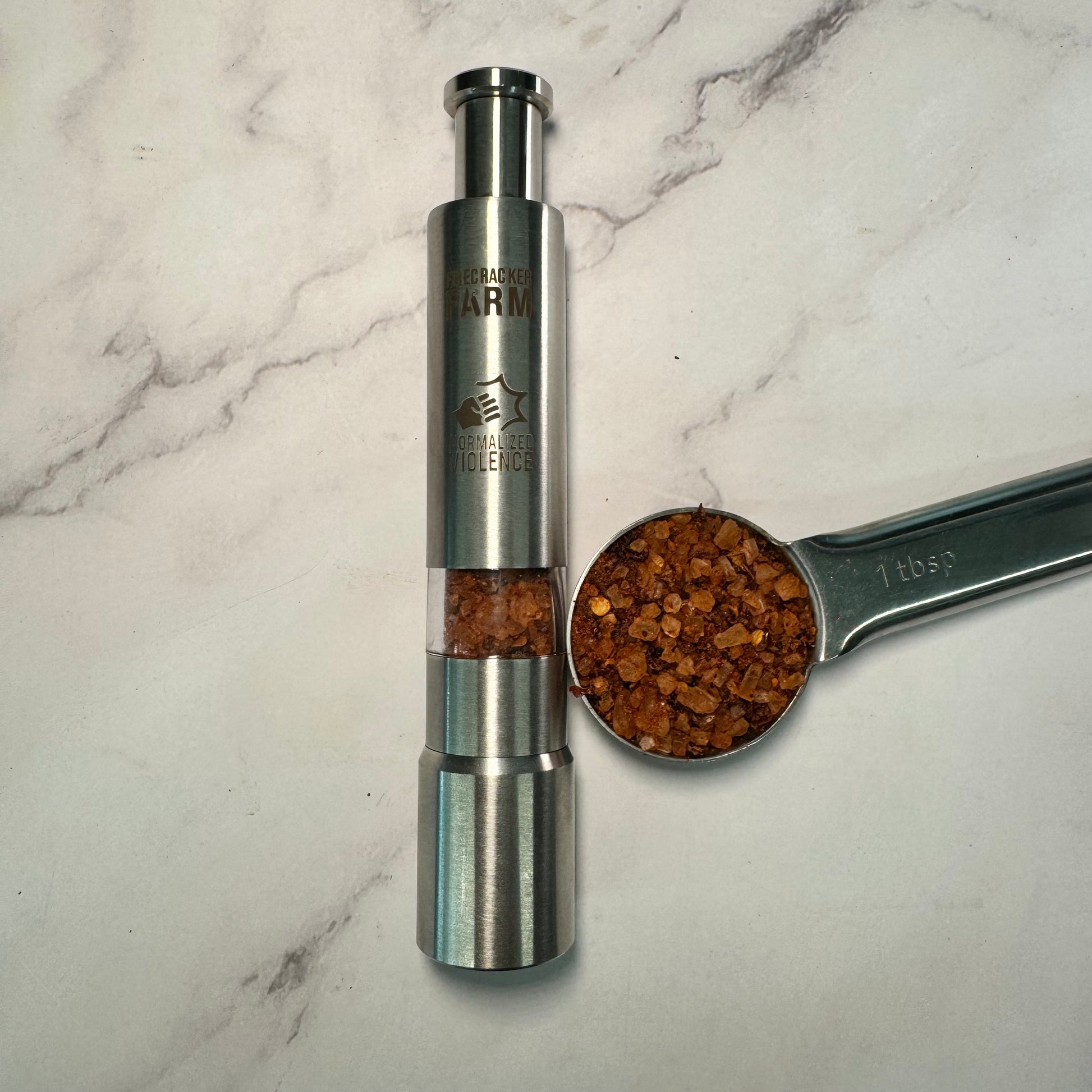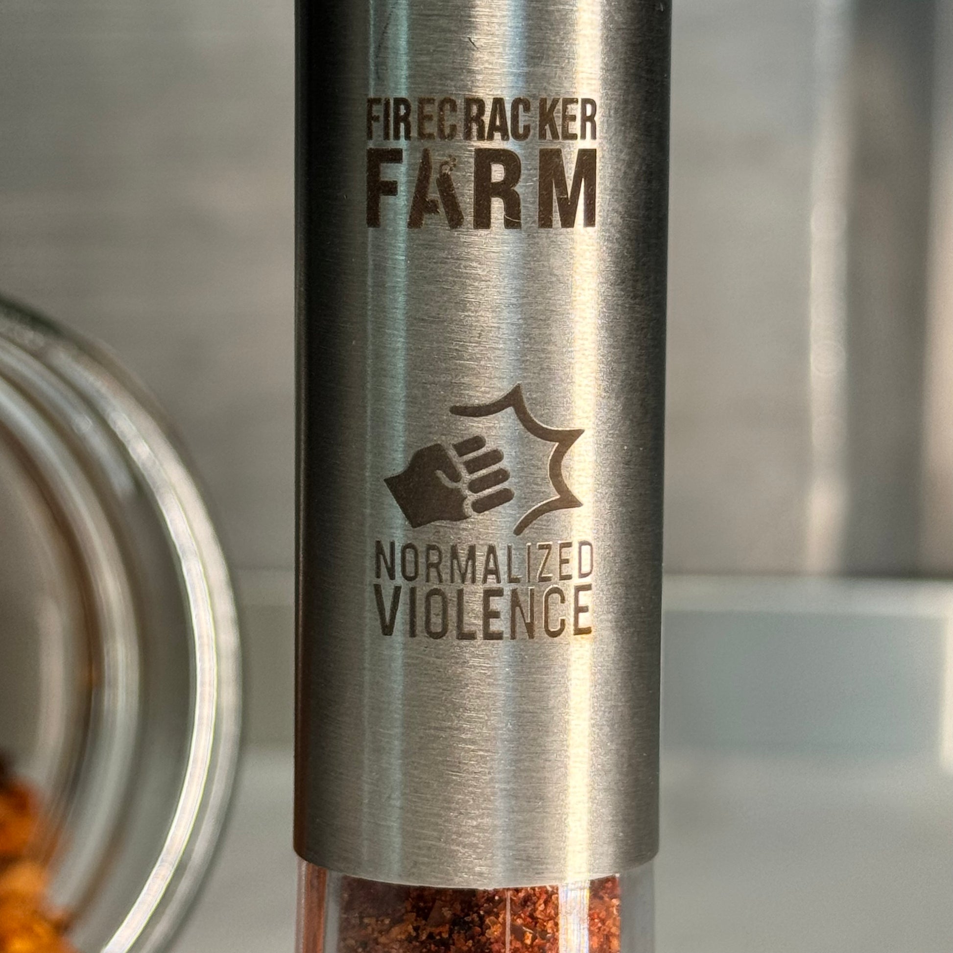 The extra special, super collectable Firecracker Farm Normalized Violence Push Grinder filled with about 17g of Normalized Violence Hot Salt
