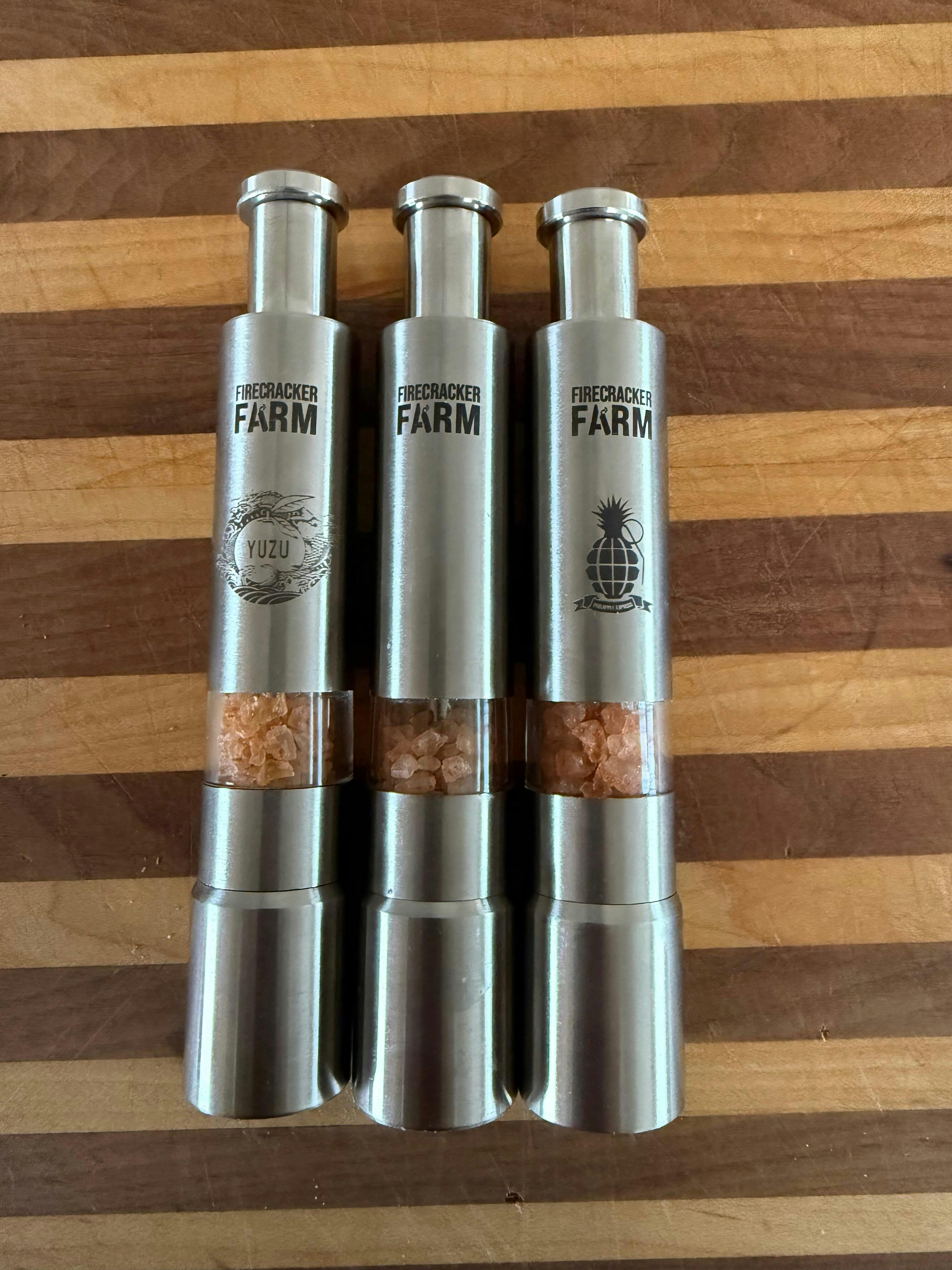 What you get: Pineapple Express is packaged in the The Firecracker Farm Pusher, a laser-etched, stainless steel, push grinder marked with the Pineapple Express logo and comes with a 25g pouch of coarse Pineapple Express Hot Salt to refill or party with. Grinder contains aprox. 17g (0.6oz) of Pineapple Express Hot Salt delivering about 515 presses of spicy, savory delight when full. The push grinder is easily refilled with Hot Salt from when the grinder finally runs out.