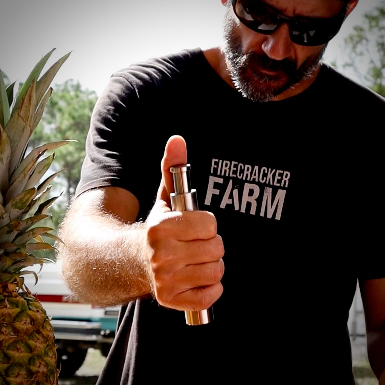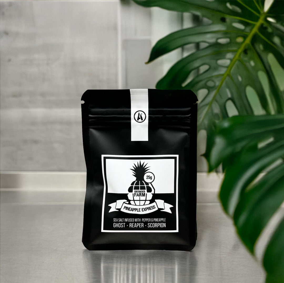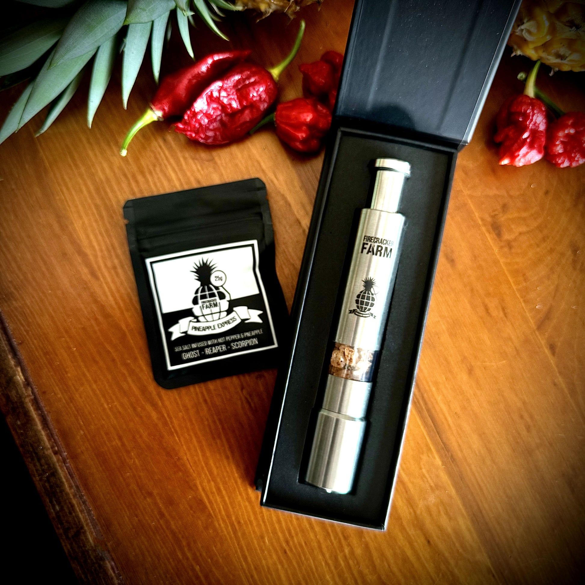 What you get: Pineapple Express is packaged in the The Firecracker Farm Pusher, a laser-etched, stainless steel, push grinder marked with the Pineapple Express logo and comes with a 25g pouch of coarse Pineapple Express Hot Salt to refill or party with. Grinder contains aprox. 17g (0.6oz) of Pineapple Express Hot Salt delivering about 515 presses of spicy, savory delight when full. The push grinder is easily refilled with Hot Salt from when the grinder finally runs out.