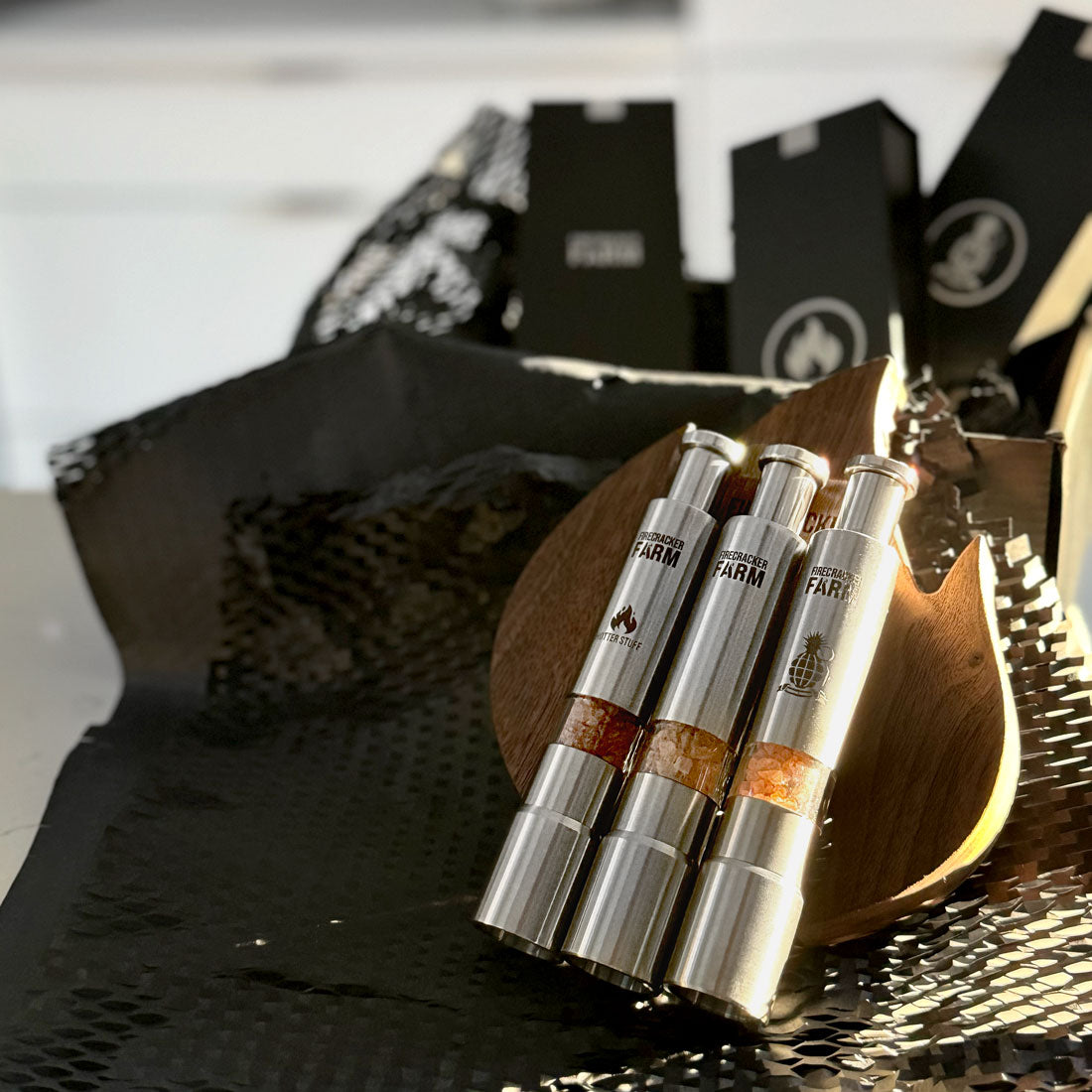 1 x Three Kings Hot Salt & Refill - In a laser etched stainless steel Firecracker Farm Push Grinder + 50g Refill and ID card. How Hot? 🔥🔥🔥 (3/5). This is the O.G. Classic that started it all. When people say "Firecracker Salt" or "Hot Salt" this is what they're referring to.